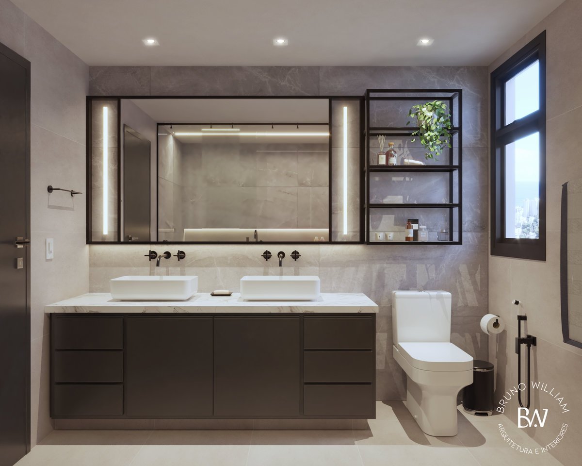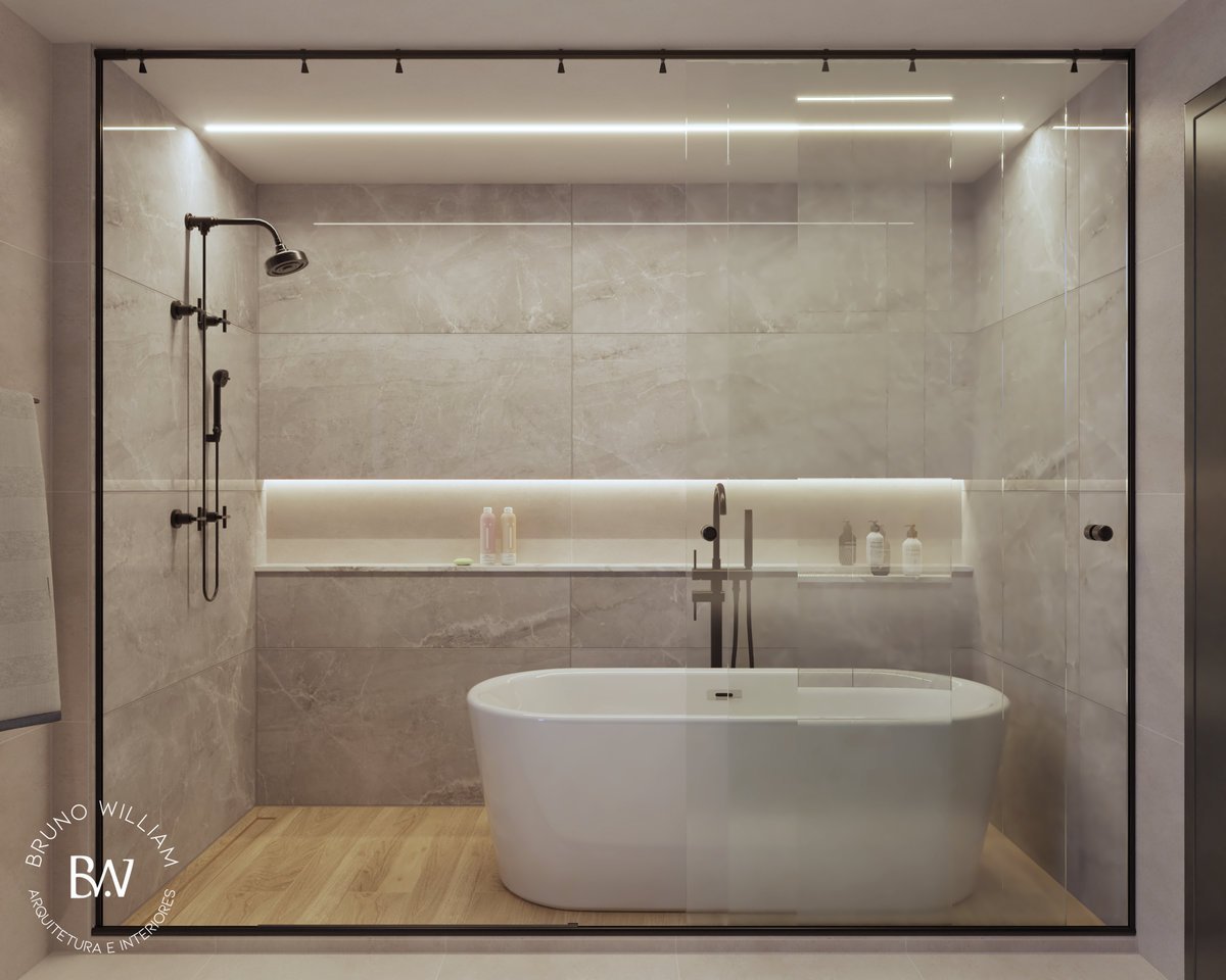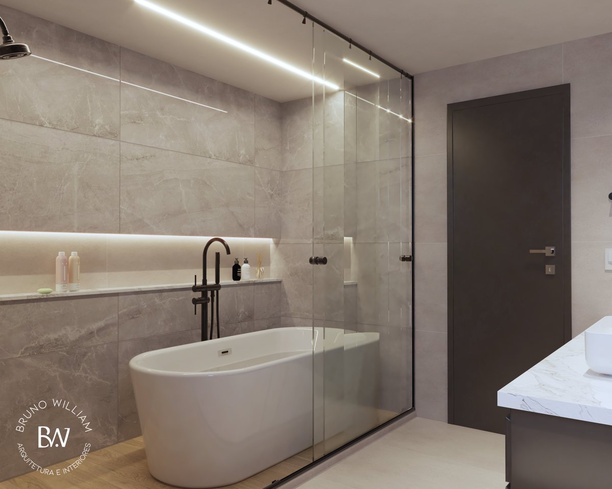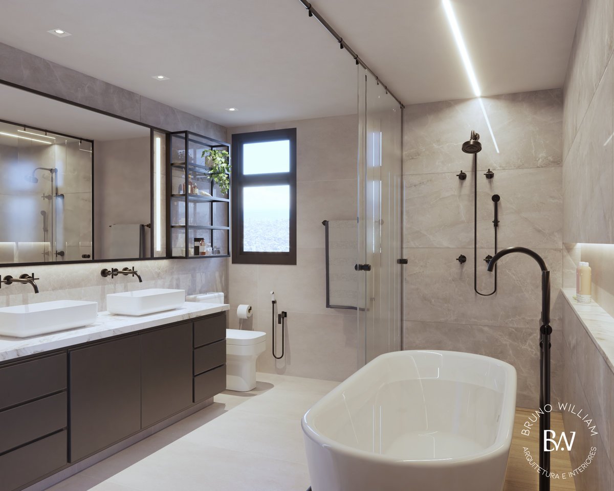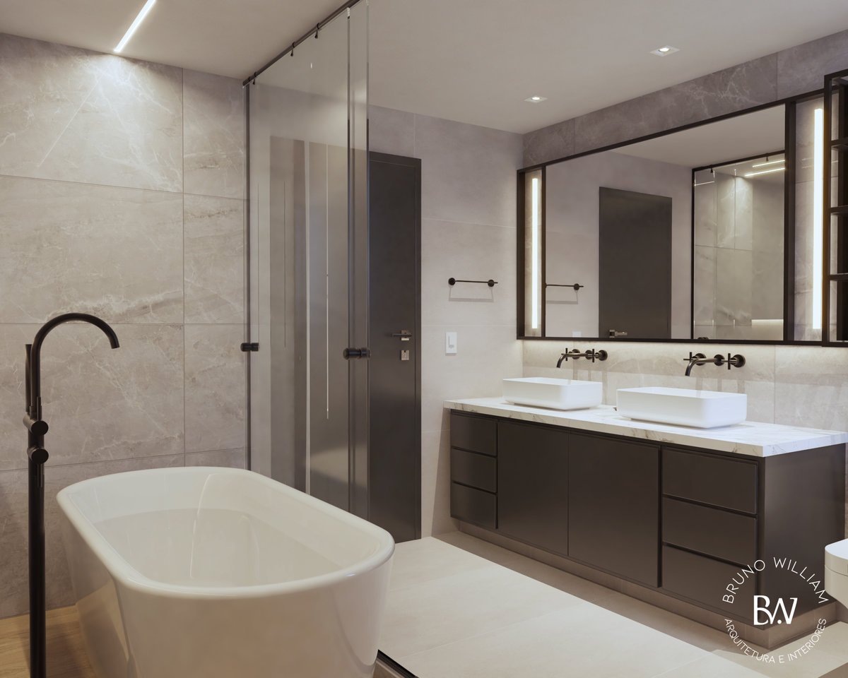 Um banheiro pensado como um spa, onde o preto traz sofisticação e profundidade ao espaço. A banheira se torna protagonista, criando uma atmosfera de relaxamento e pausa. Iluminação e materiais se equilibram para transformar o ritual diário em experiência.