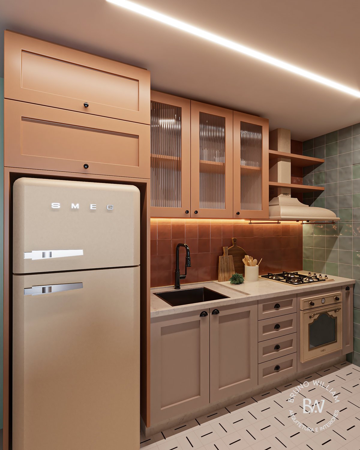Nesta cozinha os tons terrosos, neutros e o charme dos eletros retrô se misturam para criar um ambiente acolhedor, cheio de personalidade e com aquele charme vintage que nunca sai de moda. Cada detalhe foi pensado para unir estética, funcionalidade e personalidade. Os acabamentos, metais e cores conversam entre si, criando um espaço acolhedor e cheio de estilo. Um toque vintage, um design atemporal.