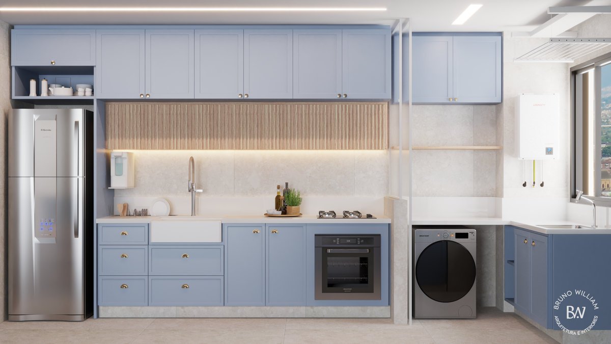Cozinha e Área de serviço integradas em um ambiente leve, funcional e cheio de personalidade. Os tons suaves trazem aconchego, enquanto a marcenaria bem planejada garante praticidade no dia a dia. A iluminação e os acabamentos foram escolhidos para transformar rotina em conforto e bem-estar.