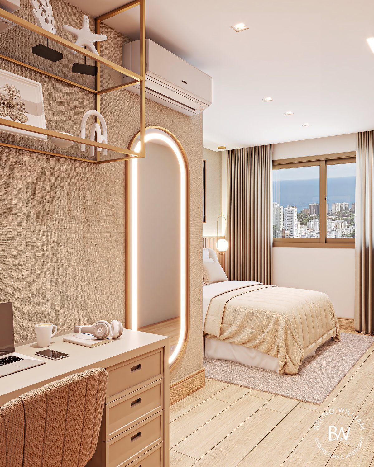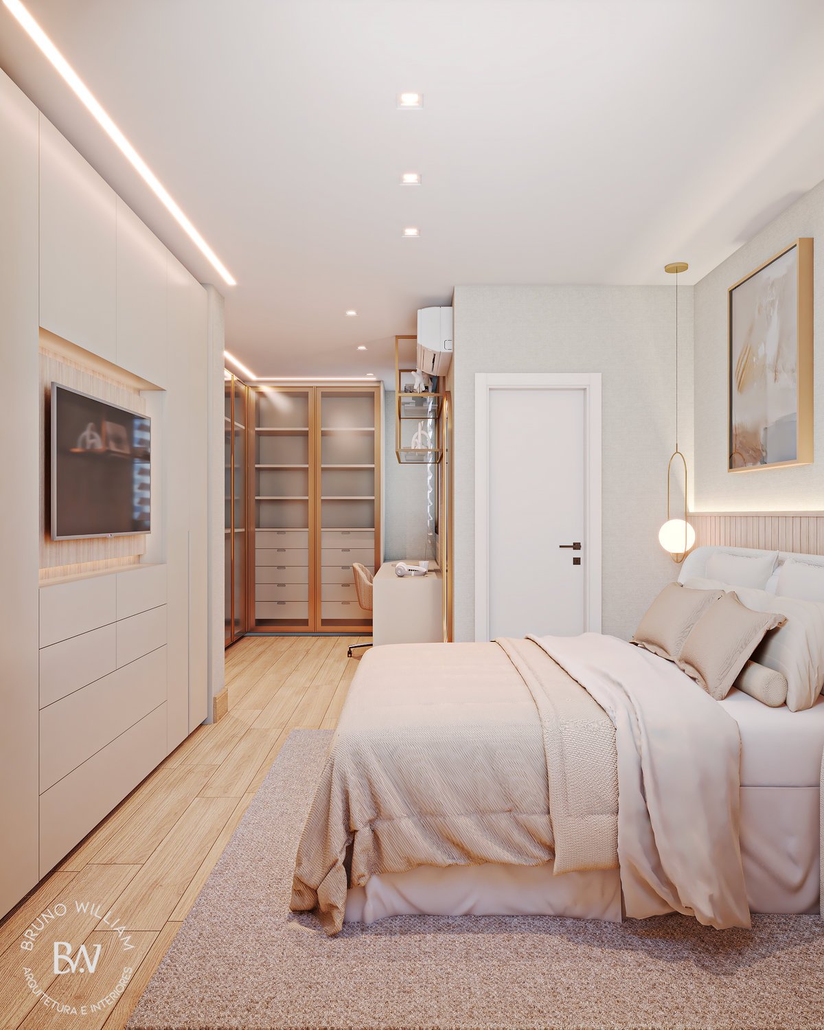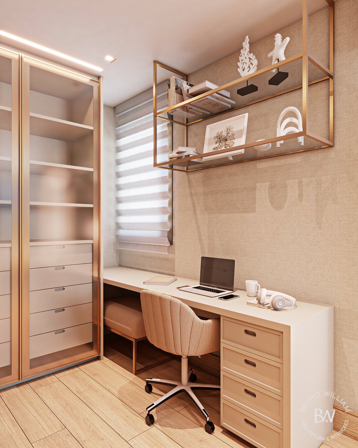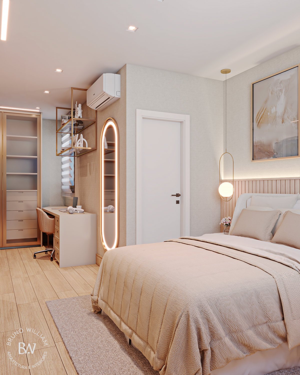 Projeto de uma suíte com iluminação natural, tons delicados e o uso de madeira clara, promovendo uma sensação de harmonia e leveza, enquanto os detalhes em ouro acrescentam um toque de elegância ao ambiente, que é complementado por um closet/home office funcional para o casal.