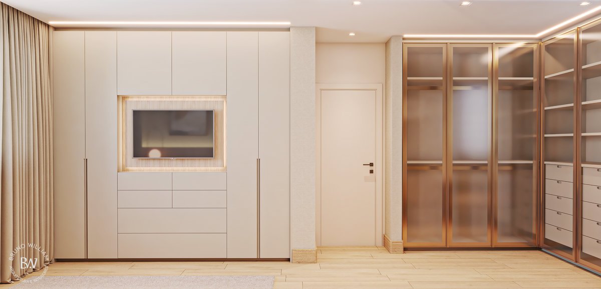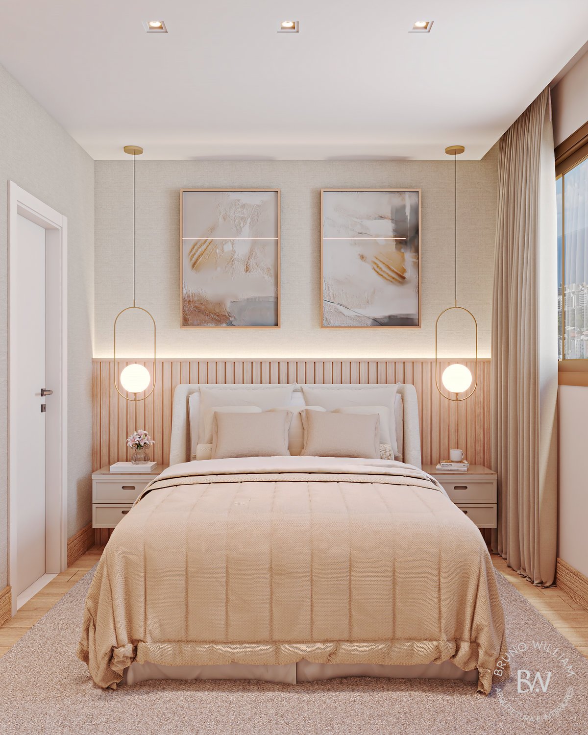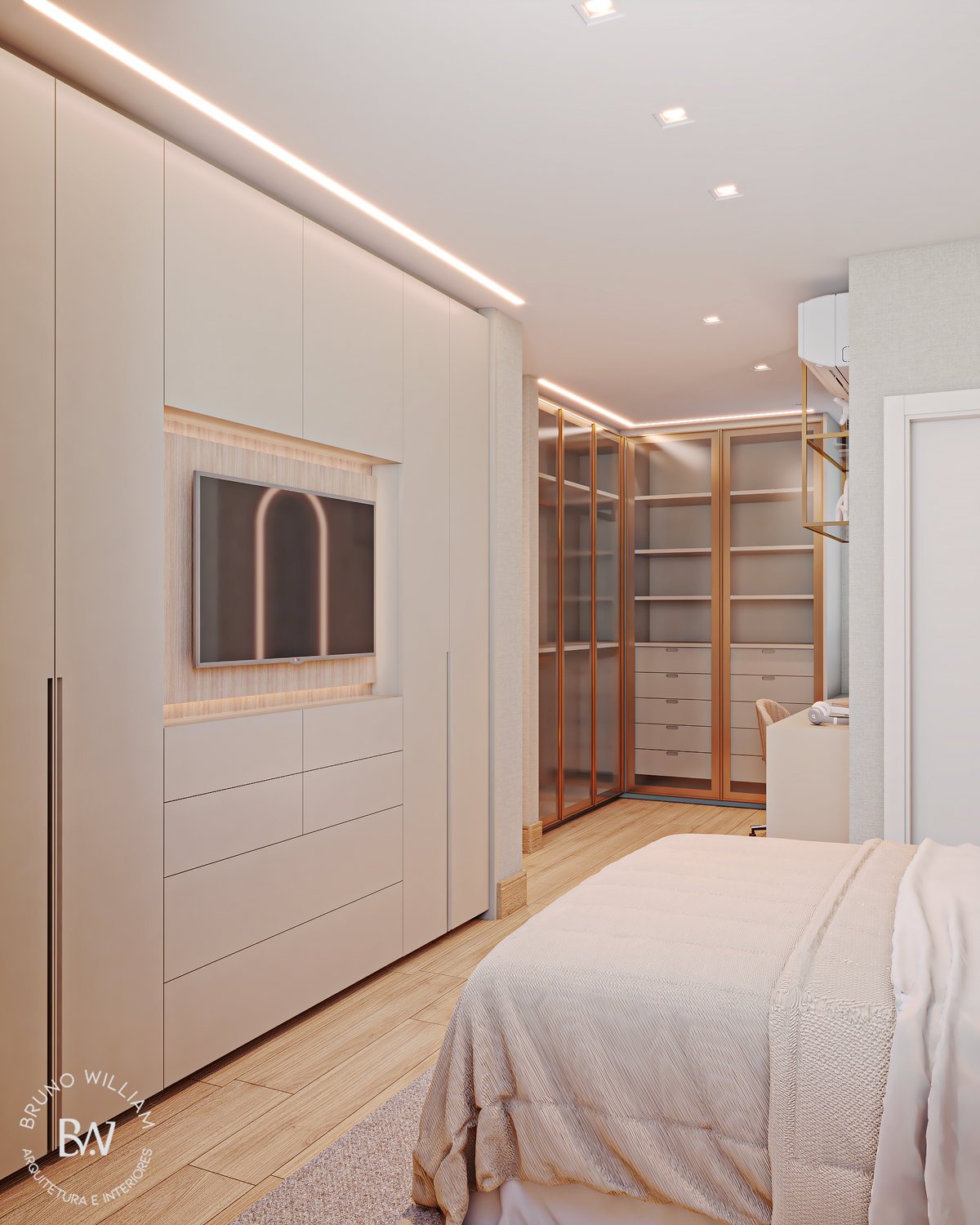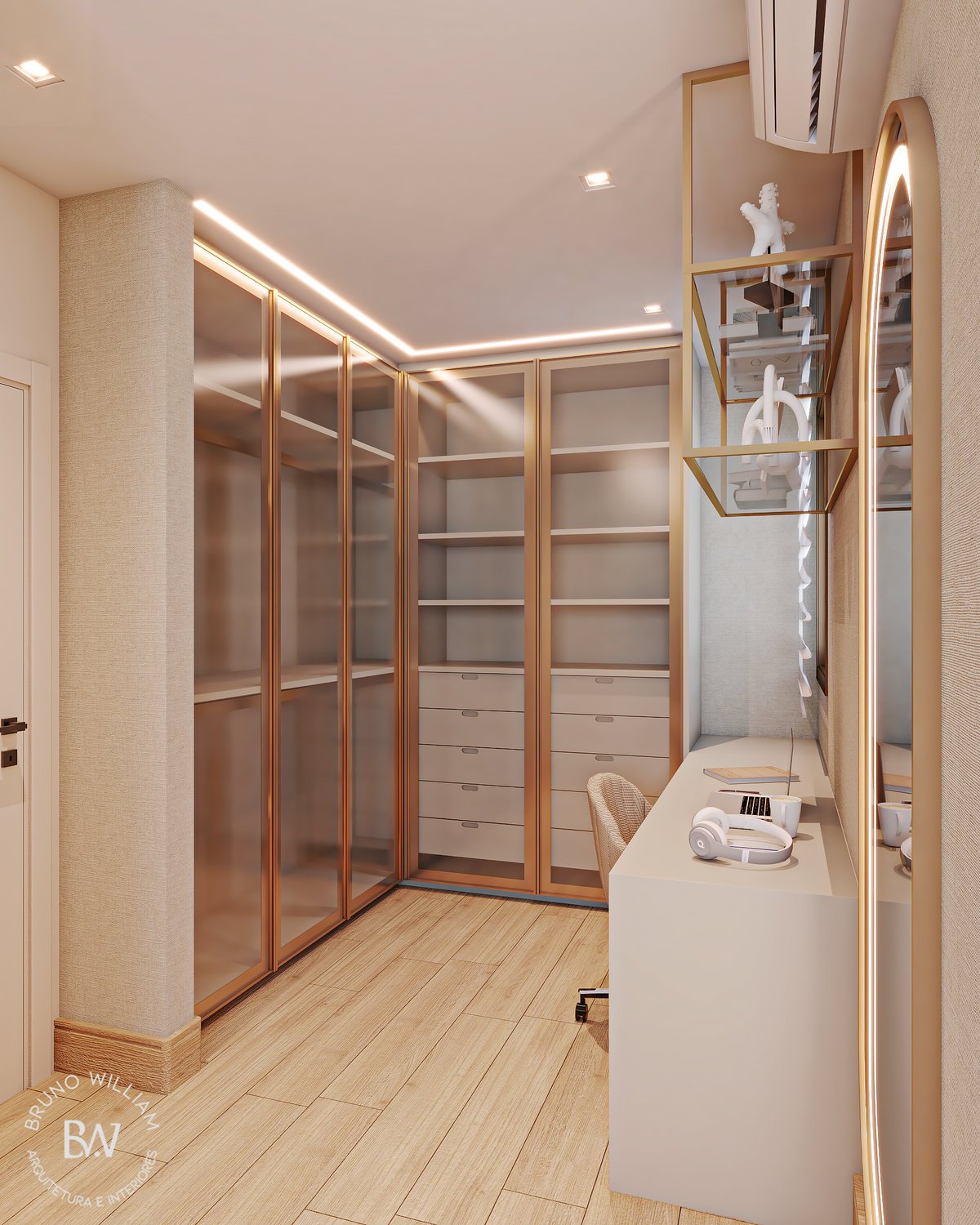 Projeto de uma suíte com iluminação natural, tons delicados e o uso de madeira clara, promovendo uma sensação de harmonia e leveza, enquanto os detalhes em ouro acrescentam um toque de elegância ao ambiente, que é complementado por um closet/home office funcional para o casal.